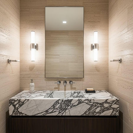 The residence sets the gravitas of monolithic stone in dynamic counterpoint to warm metals and tactile fabrics, forging a distinct urban world of sculptural form and material integrity